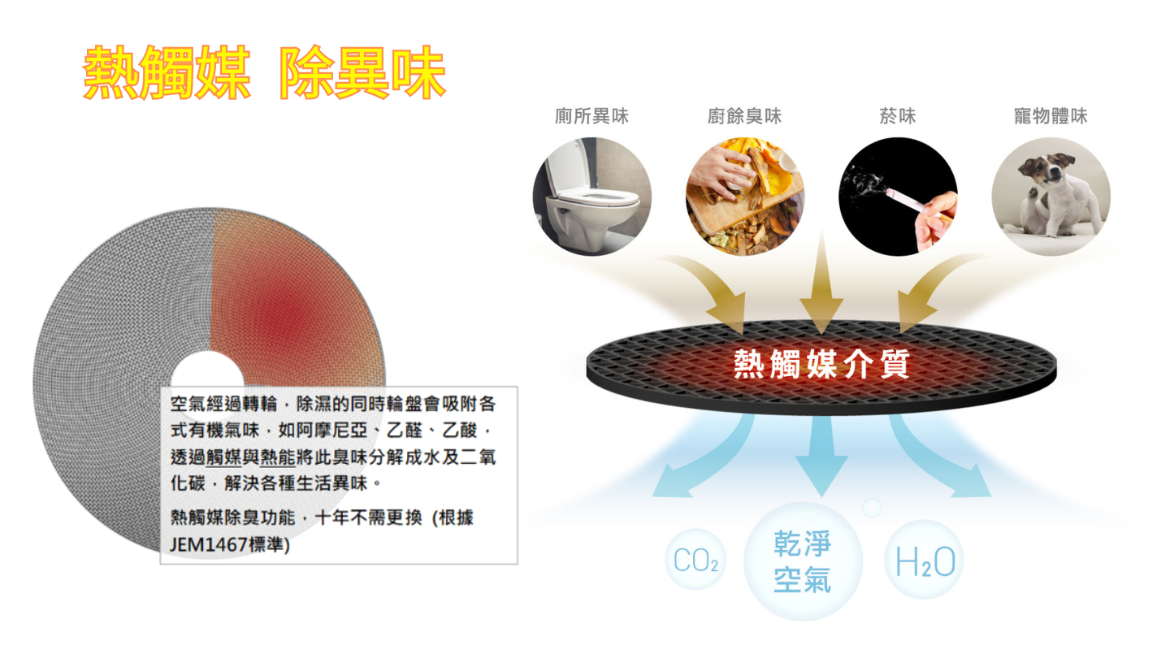 日本製造除濕輪,利用高分子吸濕材質吸附空氣中的濕氣,再透過加熱方式脫附,釋放乾燥空氣回室內。全年皆能穩定除濕,即使在冬季或低溫環境也不打烊。
