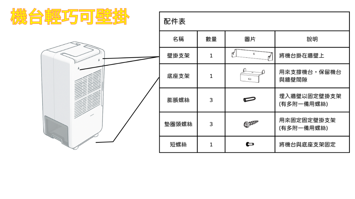 | 包裝內容 | 除濕機本體 ×1、抗過敏酵素濾網 ×1(已安裝於機器內)、說明書 ×1 壁掛架螺絲組 x 1、L型彎頭 x 1 |